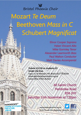 Bristol Phoenix Choir offers an opportunity to hear lesser-known works by three of the best-known composers. Mozart's bright, hopeful Te Deum, written when he was very young, is followed by Schubert's celebratory setting of the Magnificat. The Mass in C was Beethoven's first setting of the Mass and his personal response to the text is sometimes surprisingly quiet yet emotional.