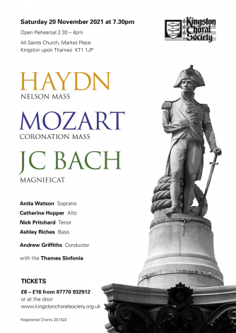 On Saturday 20 November at 7.30 pm you can join with Kingston Choral Society in celebrating their return to the stage at All Saints Kingston after almost two years as they perform a glorious programme of classical works. Mozart’s grand Coronation Mass is paired with a charming Magnificat by Johann Christian Bach, before Haydn’s mighty Nelson Mass provides a stirring climax. Appropriately, this wonderful piece is subtitled Mass in troubled times. In it clouds gather ominously before Haydn’s irrepressible spirit shines through, and joy triumphs over adversity.