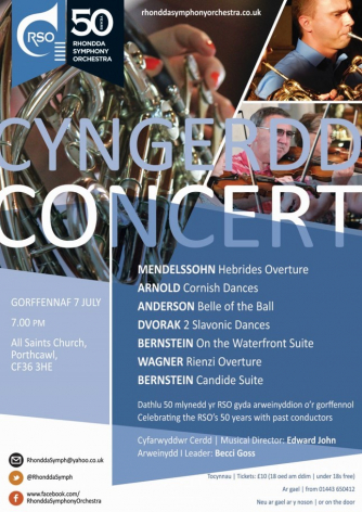 Add to my Calendar 07-07-2018 19:00 07-07-2018 21:00 36 Celebrating 50 years of Rhondda Symphony Orchestra This is the 2nd concert as part of the RSO 50th Anniversary year. In this special event we will look back over the first 50 years of the orchestra with pieces led by past conductors. All Saints Church, Porthcawl DD/MM/YYYYDetails