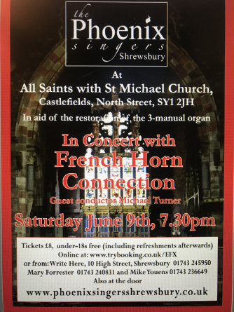 Add to my Calendar 09-06-2018 19:30 09-06-2018 21:30 36 The Phoenix Singers of Shrewsbury - Summer Concert In aid of the restoration of the 3-manual organ at All Saints with St Michael Church All Saints with St Michael Church, Shrewsbury DD/MM/YYYYDetails