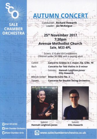 Sale Chamber Orchestra concert on 25th November features the mighty Concerto for Double String Orchestra by Tippett as well as showcasing local young talent in Bach's Double Concerto in D minor for two violins. For more information see www.salechamberorchestra.co.uk