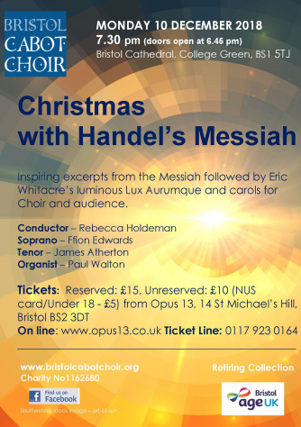 Add to my Calendar 10-12-2018 19:30 10-12-2018 21:30 36 Christmas with Handel's Messiah We will be singing excerpts from Handel's Messiah (mainly, but not exclusively from Part 1, which is particularly relevant to Christmas - and other pieces including the Hallejulah chorus, I know that my redeemer liveth and the rousing finale of Worthy is the Lamb and Amen. We will also be singing Eric Whitacre's Lux Aurumque, and carols for choir and audience. Bristol Cathedral, Bristol DD/MM/YYYYDetails