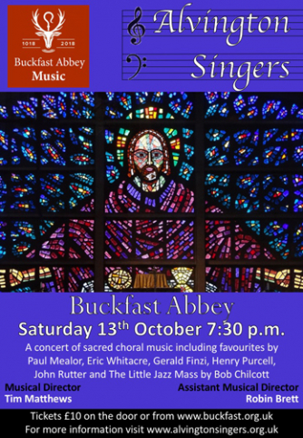 Alvington Singers' Autumn concert at Buckfast Abbey featuring Bob Chilcott's Little Jazz Mass and music through the ages from Thomas Tallis and Henry Purcell, via Gabrielle Faure to Eric Whitacre and Karl Jenkins. Tickets (£10) can be obtained via the Buckfast Abbey website (link above) but will also be available on the door.