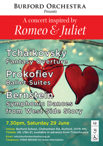 Add to my Calendar 29-06-2019 19:30 29-06-2019 21:30 36 An evening with Romeo and Juliet Burford Orchestra’s summer concert is dedicated to works inspired by Romeo and Juliet – Shakespeare’s famous star-crossed lovers. We start with Tchaikovsky’s Fantasy Overture followed by a selection of pieces from Prokofiev’s ballet, including the instantly-recognisable Dance of the Knights (known as the theme tune for the TV series the Apprentice) and finish with the spectacular Symphonic Dances from Leonard Bernstein’s West Side Story. Burford School, Burford DD/MM/YYYYDetails