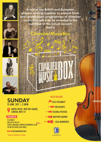 A mix of exceptional British and European players coming together to present fresh and spontaneous programmes of chamber music that will only be revealed to the audience at the actual concert: that's ChamberMusicBox! Sounds a bit like veg box? That's because in 2016 cellist and Artistic Director Julia Morneweg set out to assemble a superb group of international soloists, chamber musicians and members of leading orchestras to bring the musical equivalent to London.