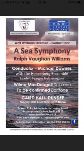 A joint concert by Dundee Choral Union and the St Andrews Chorus to celebrate the 150th anniversary of the birth of Vaughan Williams - a performance of "A Sea Symphony".