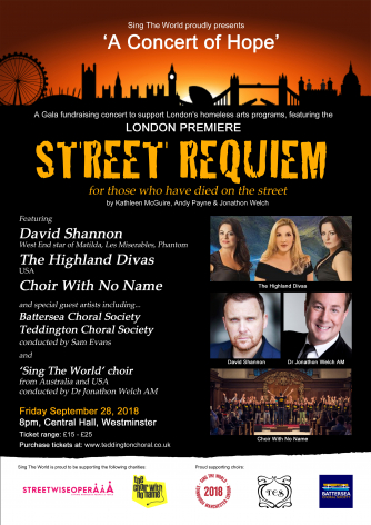 Dr Jonathon Welch AM and Sing the World 2018 together with Teddington Choral Society and Battersea Choral Society will present the London premiere of Street Requiem at "A Concert of Hope". The evening will also feature special guests artists: David Shannon a well established West End artist, The Highland Divas from USA, the Choir With No Name, Teddington Choral Society and Battersea Choral Society. Street Requiem is a contemporary setting of a traditional requiem mass and aims to bring awareness about the communities struggling with violence either in the streets or in wars. All proceeds from this evening will benefit London charities for the homeless included Streetwise Opera and Choir with No Name.
