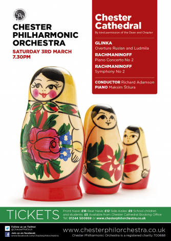 Add to my Calendar 03-03-2018 19:30 03-03-2018 21:30 36 Chester Philharmonic's Russian Classical Concert Chester Philharmonic had several requests following last season's very successful Russian Evening and so are pleased to offer another Russian Classical Romantic evening featuring the young Estonian Pianist Maksim Štšura in a performance of Rachmaninoff's second piano concerto. You will also hear Rachmaninoff's second symphony and Glinka's Ruslan and Ludmilla overture. Beautiful Russian Music not to be missed. Chester Cathedral, Chester DD/MM/YYYYDetails