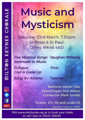 The programme features two well-known works by Ralph Vaughan Williams; Five Mystical Songs, and Serenade to MusicFive Mystical Songs, for baritone solo and optional (!) choir are settings text by 16th Century metaphysical poet George Herbert, while Serenade to Music explores discussions about music and the music of the spheres with text fromThe Merchant of Venice by William Shakespeare. We complete the concert with music by John Tavener – Song for Athene, heard at the funeral of Diana, Princess of Wales – and Gerald Finzi; his triumphant God is gone up (words by the metaphysical poet Edward Taylor) and his meditative Eclogue  the exquisite slow movement of his unfinished piano concerto.