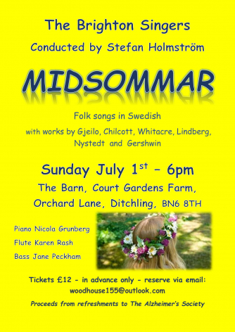 Add to my Calendar 01-07-2018 18:00 01-07-2018 20:00 36 Midsommar enjoy a summer's evening in the countryside with a programme of beautiful choral music performed by the Brighton Singers chamber choir under the baton of Stefan Holmström. English wines available. Court Gardens Farm, Hassocks DD/MM/YYYYDetails