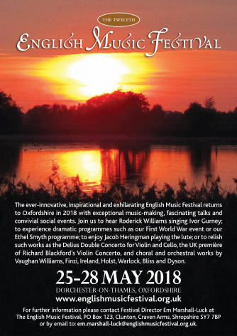Opening the festival this year, on the evening of Friday 25th May in Dorchester Abbey, is the English Symphony Orchestra under conductor John Andrews who will perform the world première performance of Christopher Wright’s Symphony. Described as ‘listener-friendly’ by BBC Music, and as having ‘creative surge and invention and exceptional talent’ by The Strad, Wright’s wistful and reflective music is often inspired by the landscapes of his native Suffolk. The orchestra is joined by violinist Rupert Marshall-Luck for the UK première performance of the Violin Concerto by Oxford-based composer, Richard Blackford, written in 2007 at special request of the composer and conducted by him in this performance. Previous visitors to the English Music Festival may recall Blackford’s engaging orchestral appetizer, Spirited. These contemporary works straddle a performance of one of Frederick Delius’s most popular concertos; the Double Concerto for Violin and Cello, to be given by violinist Rupert Marshall-Luck and cellist Joseph Spooner.