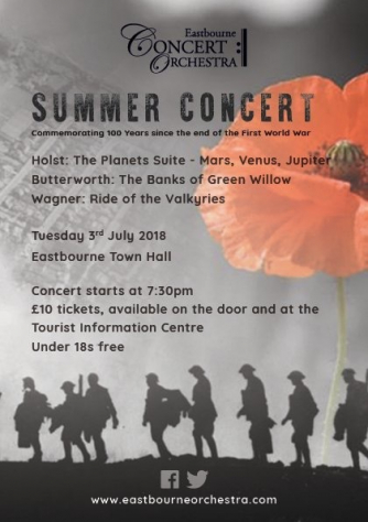 Add to my Calendar 03-07-2018 19:30 03-07-2018 21:30 36 Summer Concert Join us on Tuesday 3rd July for an evening of war music to commemorate 100 year since the end of the First World War. We will be performing music associated with war and music by composers caught up in the Great War from Wagner's Ride of the Valkyries to Holst's famous Planets and Butterworth's Banks of Green Willow. We welcome two soloists, our very own leader Simon Smith and the young soprano Polly Clarke. Eastbourne Town Hall, Eastbourne DD/MM/YYYYDetails