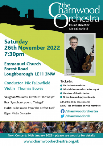 Charnwood Orchestra performs a programme of english music. The orchestra welcomes the renowned violinist Thomas Bowes to perfrom Elgar Violin Concerto. This promises to be a wonderful evening of music making and entertainment for all.