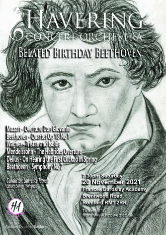 Add to my Calendar 20-11-2021 19:30 20-11-2021 21:30 36 Havering Concert Orchestra's Autumn Concert 2021 It was Beethoven's 250th Birthday last year and our concert was cancelled because of Covid-19. We kept playing virtually and in gardens and so we are so pleased to be performing this concert now. Frances Bardsley Academy, Romford DD/MM/YYYYDetails