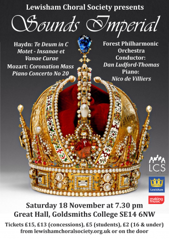 Lewisham Choral Society presents a truly regal extravaganza of choral and orchestral music by Haydn and Mozart. The professional lives of both composers were inextricably linked with the imperial court of the Holy Roman Empire, of which their Austrian homeland was a part. It is easy to see why Mozart’s majestic Coronation Mass, a blend of glorious music for choir and soloists, became a particular favourite of the Viennese court and is today still one of his most prized sacred works. This same imperial court later commissioned Haydn to compose his rousing Te Deum in C for the Emperor’s wife, Maria Theresa. The choir also presents another gem from Papa Haydn, his delightful motet Insanae et vanae curae. The dramatic opening section, describing man’s preoccupation with ‘vain and raging cares,’ contrasts with its lyrical conclusion that there is hope as long as we put our trust in God. And following a magnificent rendition of the beautiful Elvira Madigan piano concerto last November, Nico de Villiers returns to play the darker tones of Mozart’s previous keyboard work, his Piano Concerto No 20. The choir is accompanied by the Forest Philharmonic Orchestra, conducted by Dan Ludford-Thomas. A crowning achievement all round, we’re sure you’ll agree!