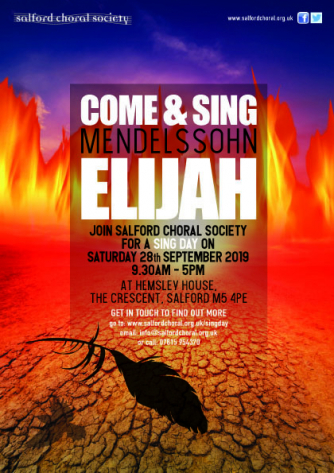 Add to my Calendar 28-09-2019 09:30 28-09-2019 11:30 36 Come and Sing Mendelssohn's Elijah Come and sing with Salford - An exciting day exploring Mendelssohn's dramatic Elijah with Tom Newall. Hemsley House, Salford DD/MM/YYYYDetails