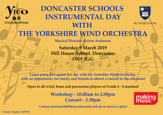 Add to my Calendar 09-03-2019 10:00 09-03-2019 12:00 36 Doncaster Schools Instrumental Day and Concert Open to all school age woodwind, brass and percussion players of grade 4 standard and above. Hill House School, Doncaster DD/MM/YYYYDetails