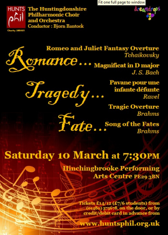 Add to my Calendar 10-03-2018 19:30 10-03-2018 21:30 36 Huntingdonshire Philharmonic Choral and Orchestral Concert We all know that music can evoke a wide range of powerful emotions, and this Huntingdonshire Philharmonic concert aims to satisfy, presenting an exciting programme featuring Romance, Tragedy and Fate. Hinchingbrooke Performing Arts Centre, Huntingdon DD/MM/YYYYDetails