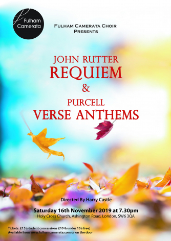 Add to my Calendar 16-11-2019 19:30 16-11-2019 21:30 36 Fulham Camerata Autumn Concert Our November 2019 concert combines two greats of English classical music, separated by over 350 years but brought together by Fulham Camerata at Holy Cross Church on Saturday November 16 in an inspiring choral programme.The works will be performed with three guest instrumentalists in addition to our gifted new keyboard accompanist, Will Fielding.Opening with a selection of Henry Purcell’s finest anthems from the 17th century, the concert moves on to John Rutter’s beautifully melodic, contemporary Requiem in seven movements. Holy Cross Church, London DD/MM/YYYYDetails