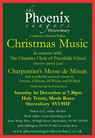 Add to my Calendar 01-12-2018 19:30 01-12-2018 21:30 36 The Phoenix Singers of Shrewsbury - Christmas Concert The Phoenix Singers of Shrewsbury present wonderful seasonal music. They are in concert with The Chamber Choir of Prestfelde School. Jeremy Lund is their Director. The orchestra is led by David Joyce Holy Trinity Church, Shrewsbury DD/MM/YYYYDetails