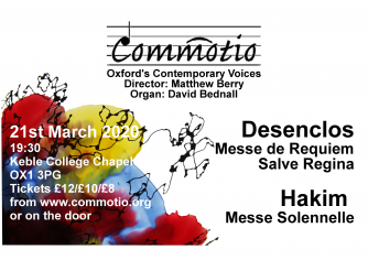 Commotio, accompanied by the organist David Bednall, is pleased to return to Keble College Chapel for a concert of music by Desenclos and Hakim, two composers steeped in the French tradition but with contrasting approaches to liturgical texts.