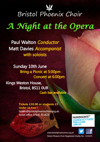 Add to my Calendar 10-06-2018 18:00 10-06-2018 20:00 36 A Night at the Opera Enjoy favourite opera choruses by Verdi, Bizet, Wagner and others, along with solos and duets. Bring a picnic to have before the concert in the beautiful grounds of Kings Weston House. The bar will be open before the concert and during the interval Kings Weston House, Bristol DD/MM/YYYYDetails