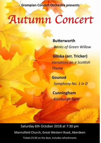 Tim Tricker conducts Grampian Concert Orchestra in their Autumn Concert to include Gounod's Symphony No. 1, Butterworth's The Banks of Green Willow and Cunningham's Edinburgh Suite. The programme also includes the premiere of Tricker's arrangement for orchestra of Glinka's Variations on a Scottish Theme.