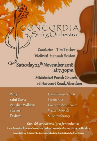 Add to my Calendar 24-11-2018 19:30 24-11-2018 21:30 36 Concordia String Orchestra Concordia String Orchestra welcomes Hannah Renton to play the Vaughan Williams Concerto Accademico. We also celebrate the Parry centenary by performing the Lady Radnor Suite. The concert includes Sibelius's earliest known piece, Water Droplets, and the premiere of 8 Variations on Water Droplets by Condordia's conductor, Tim Tricker. Midstocket Parish Church, Aberdeen DD/MM/YYYYDetails