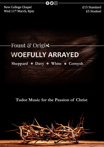 Add to my Calendar 11-03-2020 20:00 11-03-2020 22:00 36 Fount & Origin - Woefully Arrayed Passionate polyphonic works from the Tudor period, featuring John Sheppard's Media vita, Robert Whyte's Lamentations of Jeremiah (six voices), Richard Davy's Stabat Mater, and William Cornysh's Woefully Arrayed. New College Chapel, Oxford DD/MM/YYYYDetails