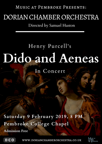 Dorian Chamber Orchestra perform Henry Purcell's only full opera, Dido and Aeneas, by candlelight in the atmospheric surroundings of Pembroke College Chapel, Cambridge. This work has long been a staple of the Baroque opera repertoire and here we present it in a stripped down form with single players per part in an intimate concert performance.