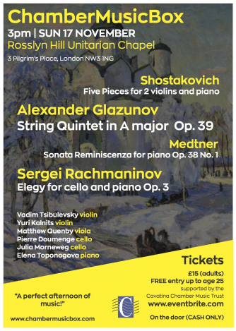 Now in its fourth season under the artistic leadership of cellist Julia Morneweg and violinist Yuri Kalnits, ChamberMusicBox is once again looking forward to welcoming an outstanding group of international soloists, chamber musicians and principals of leading British and European orchestras for its series of Sunday afternoon concerts. Generously supported by the Cavatina Chamber Music Trust, admission to all concerts is free for children and young people up to the age of 25. So whether you enjoy the great repertoire classics or love to discover something new, come and experience London's freshest chamber music!