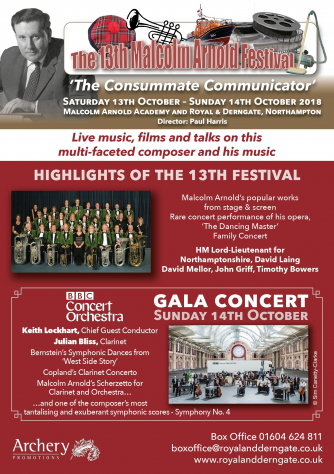 This year’s Gala concert features the BBC Concert Orchestra conducted by their Chief Guest Conductor, Keith Lockhart. The colourful programme has an American flavour, acknowledging Leonard Bernstein’s centenary this year with a performance of his ever-popular classic, Symphonic Dances from ‘West Side Story’ - a work that much inspired Malcolm Arnold, and a welcome return visit from Julian Bliss who will be the soloist in Aaron Copland’s Clarinet Concerto and Arnold’s witty and virtuosic Scherzetto. Malcolm Arnold’s Symphony no.4 brings the festival to a close in spectacular style with the exotic colour of Caribbean rhythms by way of marimba, bongos and tom toms, demonstrating why classical music can be the most exhilarating experience in what is one of the composer’s most tantalising and exuberant symphonic scores.