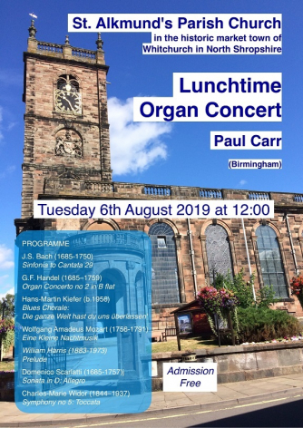 Following Paul Carr's 2018 Summer Organ Concert he was immediately invited to return again to play the fine instrument at St Alkmund's, in the historic market town of Whitchurch in North Shropshire..