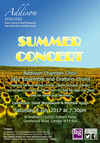 Add to my Calendar 08-07-2017 19:30 08-07-2017 21:30 36 Addison Singers summer concert A light hearted concert of 26 songs from popular composers, including many classical and jazz favourites. There will be an interval with drinks available. St Andrew's Church, London DD/MM/YYYYDetails