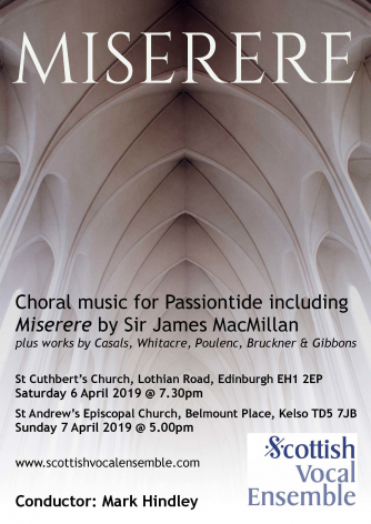 A programme of exquisite Choral music for Lent and Palm Sunday will include a rare performance of leading Scottish composer Sir James MacMillan's beautiful Miserere in his 60th birthday year.