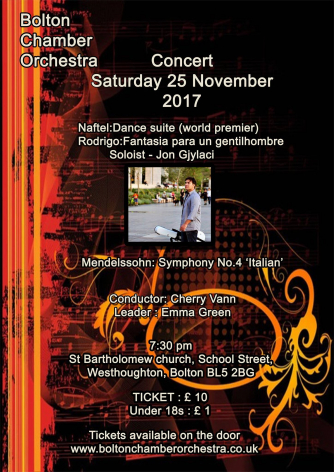 Add to my Calendar 25-11-2017 19:30 25-11-2017 21:30 36 Bolton Chamber Orchestra - An evening of Mediterranean music Bolton Chamber Orchestra is a group of musicians who love making music together. Founded in 1962, it is first and foremost a community orchestra providing opportunities for people of all ages and backgrounds to play some of the greatest works in the classical repertoire. Regarded by The Guardian as ‘’impressively expert” and by Classical Guitar Magazine as ‘’a highly talented player’’, Albanian-born Jon Gjylaci is in increasing demand as a performer due to his wide ranging repertoire, “brilliant interpretations”, “compelling quality to his guitar playing” and his ability to connect with the audience. Jon has performed in concerts and recitals across the UK as a soloist and chamber musician. This is his debut appearance with Bolton Chamber Orchestra. St Bartholomew's Church, Bolton DD/MM/YYYYDetails