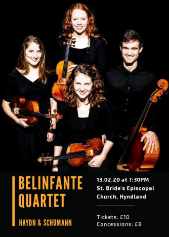 In addition to the quartets by Haydn and Schumann, the concert will also feature some arrangements of well-known Scottish tunes, by violinist, Fiona Robertson. https://www.youtube.com/watch?v=sDSU16Ug8W8