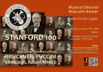 2024 has been a major year for composer anniversaries: for death centenaries alone Musicalics lists almost one hundred! Portsmouth Baroque Choir has looked back across 450 years and selected a half-dozen names associated with choral music to celebrate alongside the programme’s main feature, the centenary of the death of Sir Charles Villiers Stanford: Robert White (d. 1574), John Wilbye (baptised1574), Giacomo Carissimi (d. 1674), Anton Bruckner (b. 1824), Edward Bairstow (b. 1874) and Giacomo Puccini who, like Stanford, died in 1924.