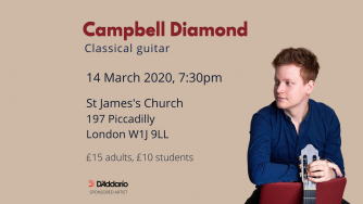 Add to my Calendar 14-03-2020 19:30 14-03-2020 21:30 36 Campbell Diamond - Classical Guitar Concert Internationally award winning guitarist Campbell Diamond performs a kaleidoscopic program of music from Brazil, Italy, Germany and more. St James's Church, London DD/MM/YYYYDetails