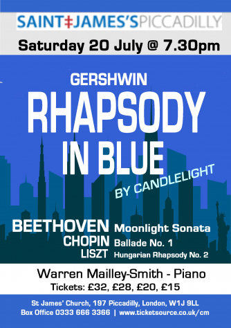 This evening the walls of St James’ Piccadilly will resound to the music of Gershwin, Chopin, Beethoven and Liszt played by virtuoso British concert pianist, Warren Mailley-Smith, under the warm flicker of candlelight.