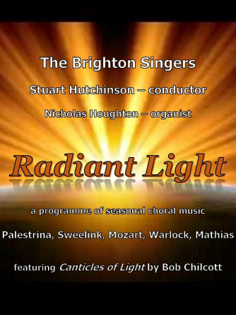The Brighton Singers chamber choir, conducted by Stuart Hutchinson, present an evening of seasonal choral pieces both acapella and with organ accompaniment. The varied programme includes Renaissance and Baroque motets, Mozart's lovely Sancta Maria, Mater Dei as well as some contemporary works. Bob Chilcott's splendid Canticles of Light features.