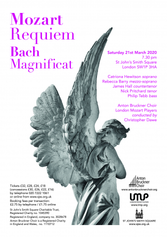Following acclaimed performances of Christmas Oratorio, St John Passion, Mass in B minor and St Matthew Passion, and a highly successful Autumn tour to Leipzig, Anton Bruckner Choir and founder conductor Christopher Dawe return to St John’s Smith Square to complete their Bach odyssey. Fittingly the cycle concludes with the Magnificat in D, a microcosm of Bach’s choral music that packs into a scintillating half hour the full gamut of emotions, ranging from dazzling trumpet-led celebration to intensely felt spiritual intimacy. By way of contrast Mozart’s swansong, Requiem provides an opportunity to explore a range of darker colours within the overall spectrum of D major/minor, the sombreness of Mozart’s characteristic tragic key underlined with a rich scoring that draws on the imposing heft of trombones and basset horns.