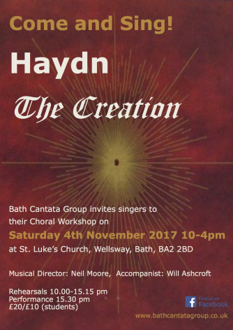 Bath Cantata Group (Bath’s longest running chamber choir, established in 1955) is delighted to invite singers for our fourth Come and Sing Choral Workshop. We will be singing the choruses from Haydn's wonderful oratorio The Creation, in English.