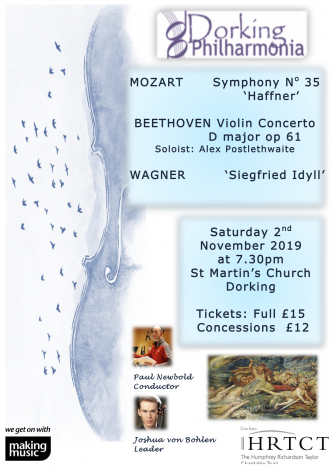 Add to my Calendar 02-11-2019 19:30 02-11-2019 21:30 36 Dorking Philharmonia The Dorking Philharmonia play Beethoven, Mahler and Mozart. Alex Postlethwaite is the soloist in the Beethoven violin concerto. St Martin's Church, Dorking DD/MM/YYYYDetails
