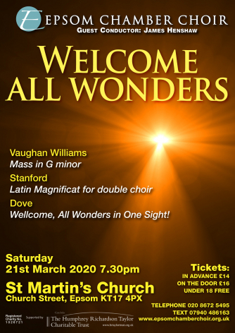 Inspiring the title of Epsom Chamber Choir’s spring concert is music by contemporary British composer Jonathan Dove. It isn’t the only work expressing spiritual wonder, however: included on the bill are Vaughan Williams’ Mass in G minor, Stanford’s Latin Magnificat and John Tavener’s Hymn to the Mother of God.