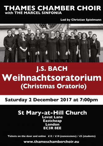 Add to my Calendar 02-12-2017 19:00 02-12-2017 21:00 36 Thames Chamber Choir presents Bach's Christmas Oratorio TCC has had a fantastic busy year with concerts in London, Germany and Hastings. We are looking forward to singing Bach's Christmas Oratorio in a chamber setting and bringing our music to the City of London. Please go to our website for more information or follow us on Facebook or Twitter. St Mary-at-Hill Church, London DD/MM/YYYYDetails