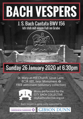 On 26 January we will be performing BWV 156, Ich steh mit einem Fuß im Grabe with its irresistible opening Sinfonia with solo oboe. This service of Bach Vespers will also feature other German Baroque music, all performed on period instruments.