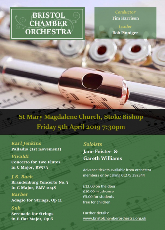 Add to my Calendar 05-04-2019 19:30 05-04-2019 21:30 36 Bristol Chamber Orchestra Spring Concert Bristol Chamber Orchestra Spring Concert with soloists Jane Foister & Gareth Williams St Mary Magdalene Church, Bristol DD/MM/YYYYDetails