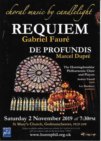 Lovers of French Romantic sacred choral music should save the date Saturday November 2nd, and head to St Mary’s Church in Godmanchester where the Huntingdonshire Philharmonic Choir and Players are performing Requiem by Gabriel Fauré and De Profundis by Marcel Dupré, by candlelight.