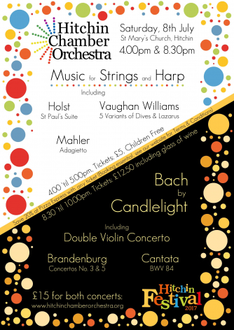 The HCO presents two concerts on Saturday July 8th in St. Mary’s Church, Hitchin at 4 pm - ‘Music for Strings and Harp’ - and again the same day at 8:30 pm - ‘Bach by Candlelight’. These events, given as part of this year’s Hitchin Festival, see the orchestra continue to deepen its partnership with national profile musicians David Murphy, Warwick Cole and new this summer, Liz Poole and Daniel de Fry.